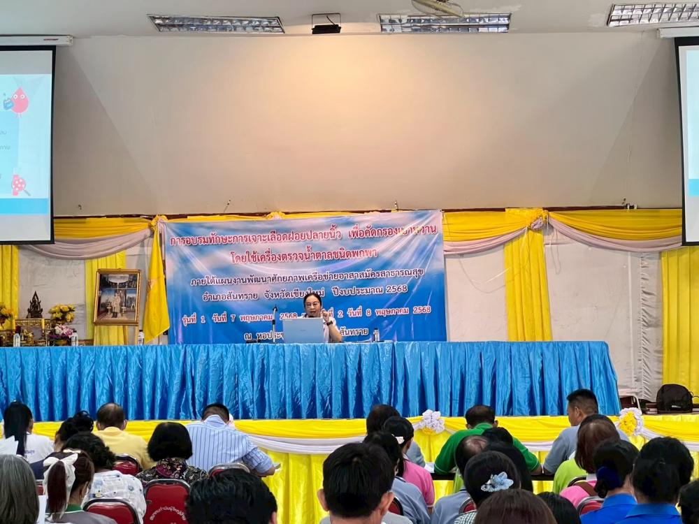 วันที่ 7 พฤษภาคม 2568 สำนักงานสาธารณสุขอำเภอสันทราย โดยมีนายสมชาย นันทวัฒนากรณ์ สาธารณสุขอำเภอ เป็นประธานในพิธี เปิดอบรมทักษะการเจาะเลือดฝอยปลายนิ้ว เพื่อคัดกรองเบาหวานโดยใช้เครื่องตรวจน้ำตาลชนิดพกพา ภายใต้เเผนงานพัฒนาศักยภาพเครือข่ายอาสาสมัครสาธารณสุข อำเภอสันทราย จังหวัดเชียงใหม่ ปีงบประมาณ 2568 ณ หอประชุมที่ว่าการอำเภอสันทราย